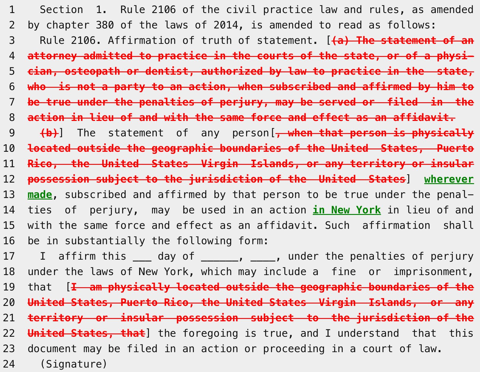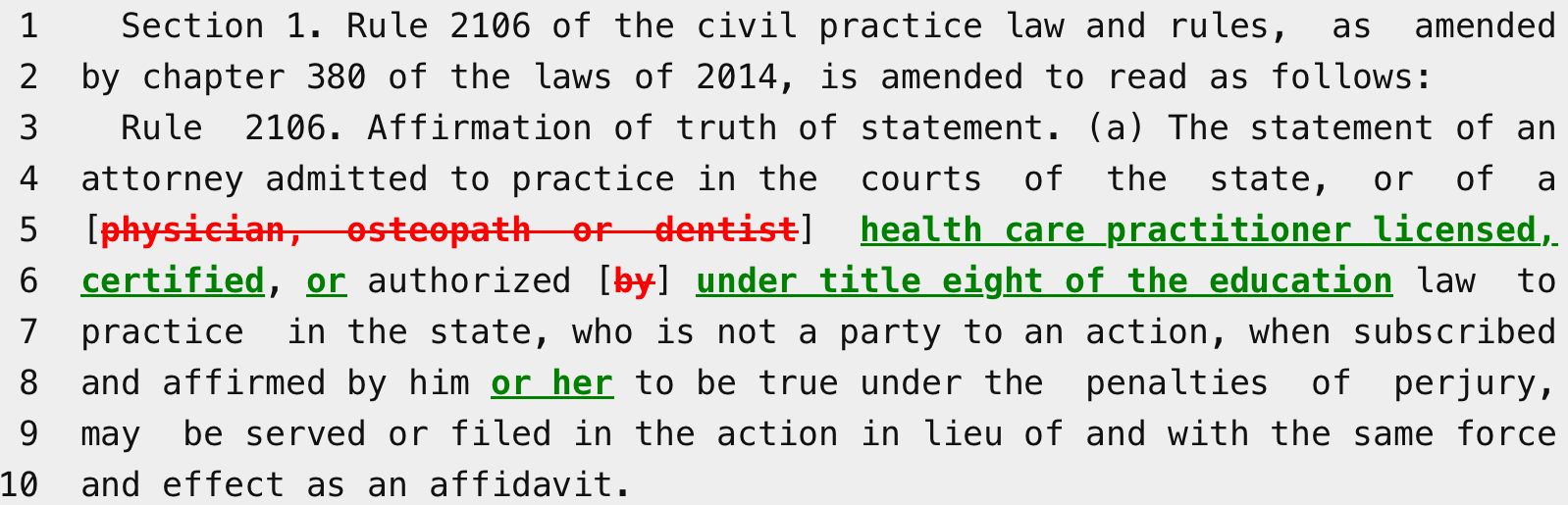 On October 25, 2023, Gov. Kathy Hochul signed A06065 / S02997 into law, amending CPLR Rule 2106 to allow affirmations in civil actions to be made by all licensed health care professionals, not just physicians, osteopaths, or dentists. This change is effective immediately. See New York Allows Health Care Professionals to Make Affirmations in Civil Actions, Starting 10/25/2023.