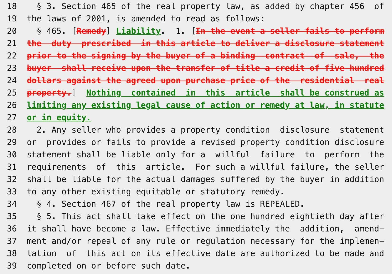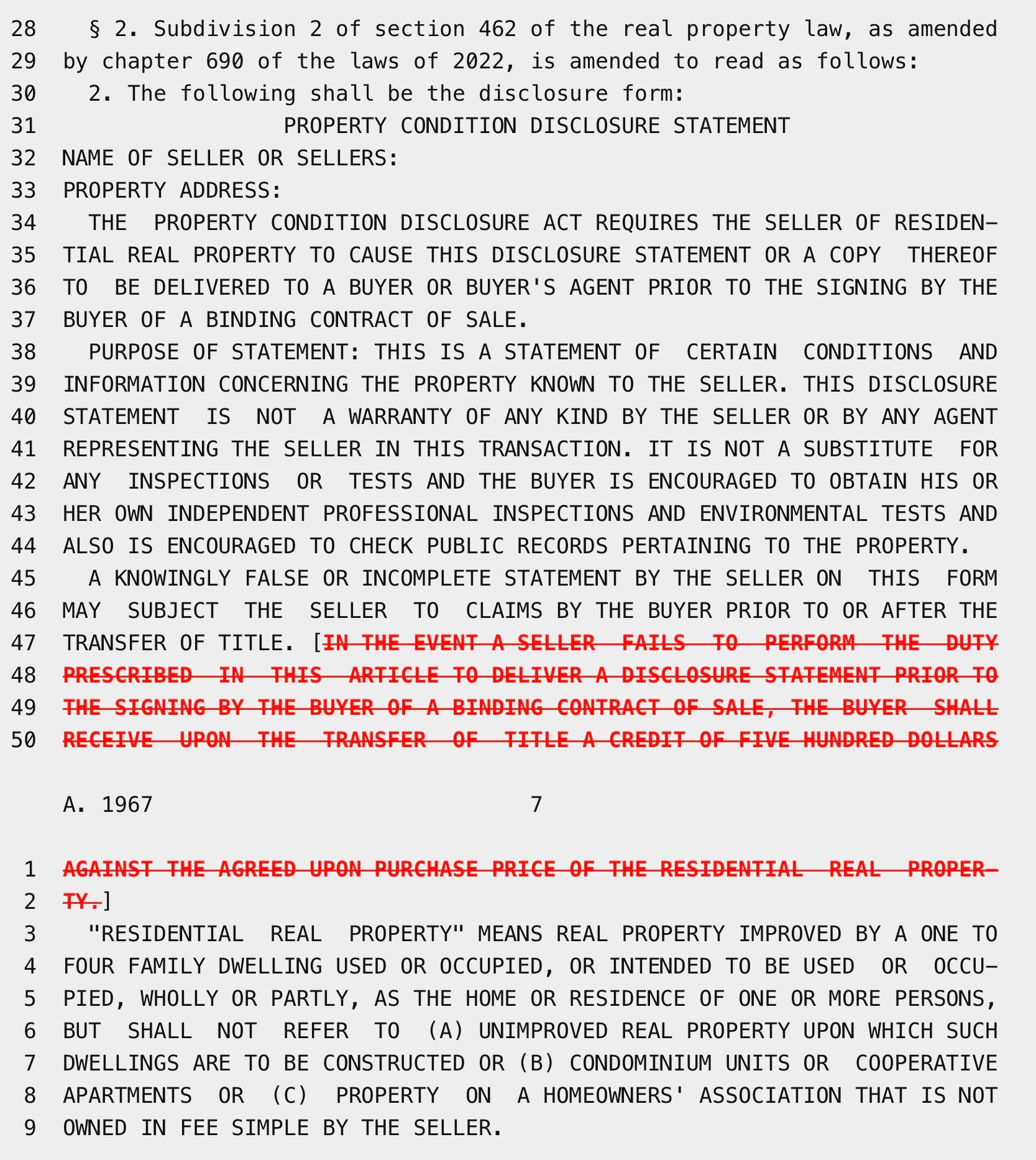 The statutory Property Condition Disclosure Statement set forth in RPL § 462(2) no longer allows a $500 credit. This screenshot of the legislation shows how the statute has been revised: