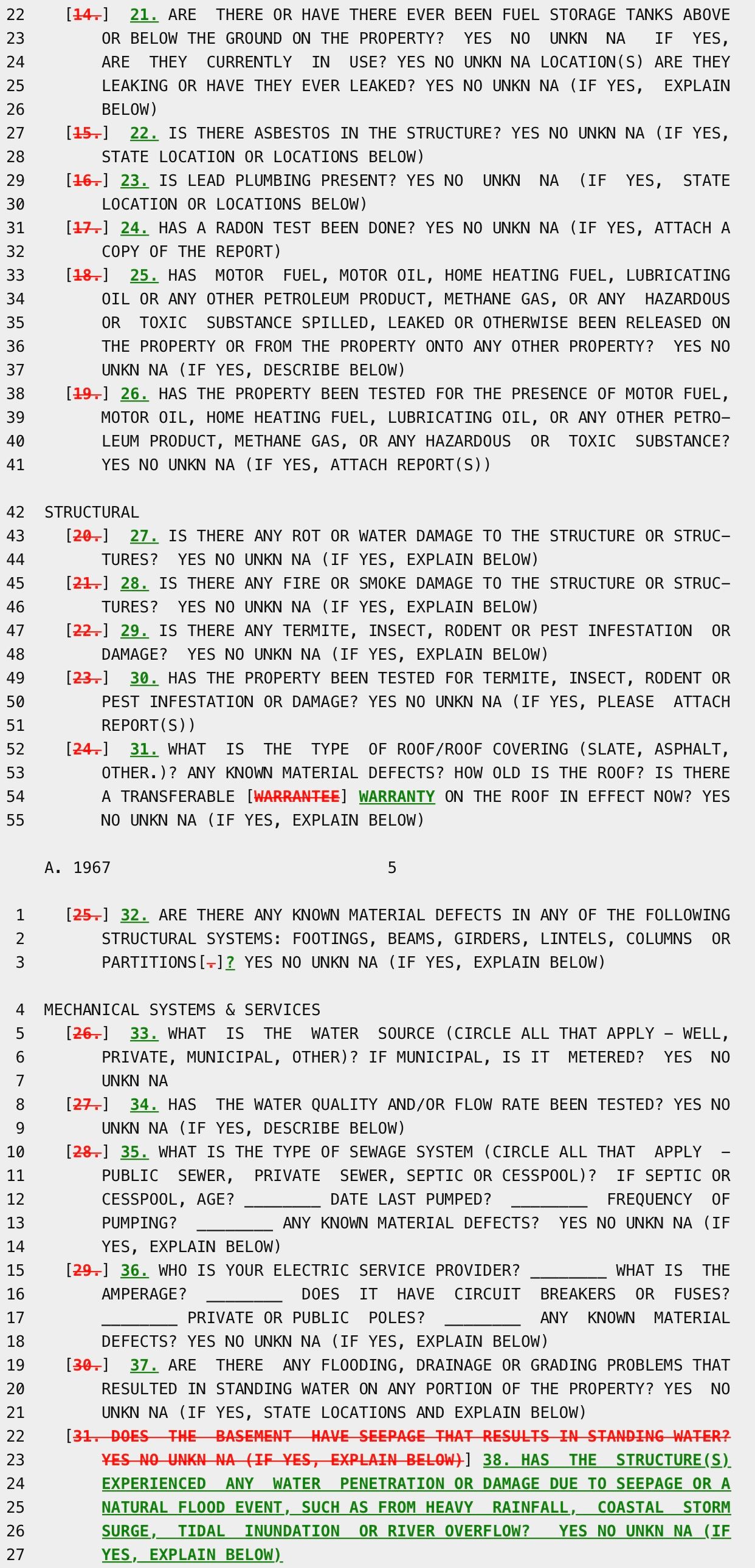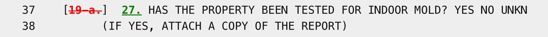 The screen capture above shows the changes to the PCDS that were made by A03714/S05097-A. They reflect the current state of the PCDS today, where Question 19-a is the mold history question. But, as I will discuss in sections (2) and (3) below, on September 22, 2023 Gov. Hochul revised the PCDS again and those changes will become effective on March 20, 2024. When the changes become effective, Question 19-a will be renumbered to Question 27: