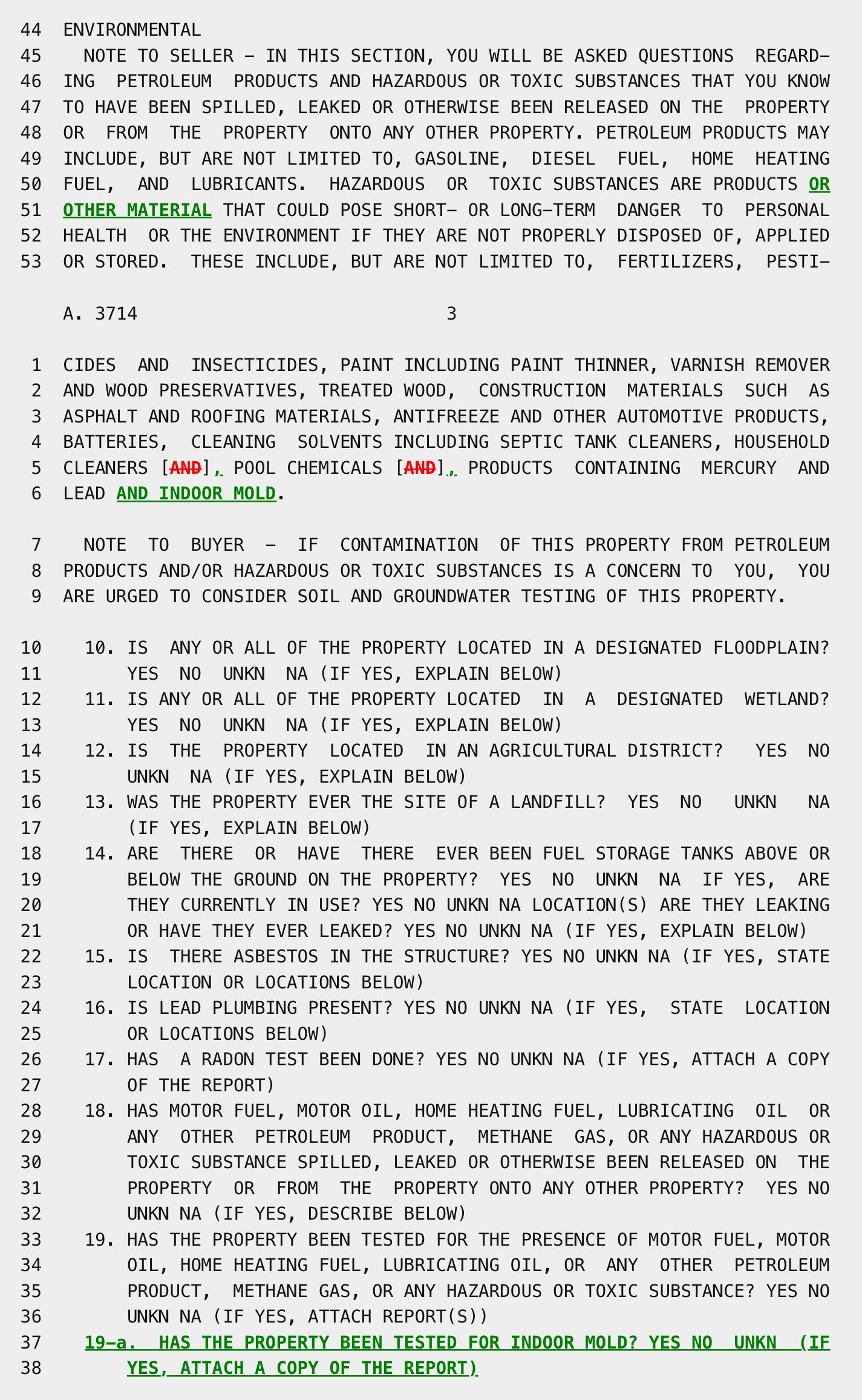 The legislation added question 19-a to the PCDS, requiring sellers to answer whether the property has been tested for indoor mold: