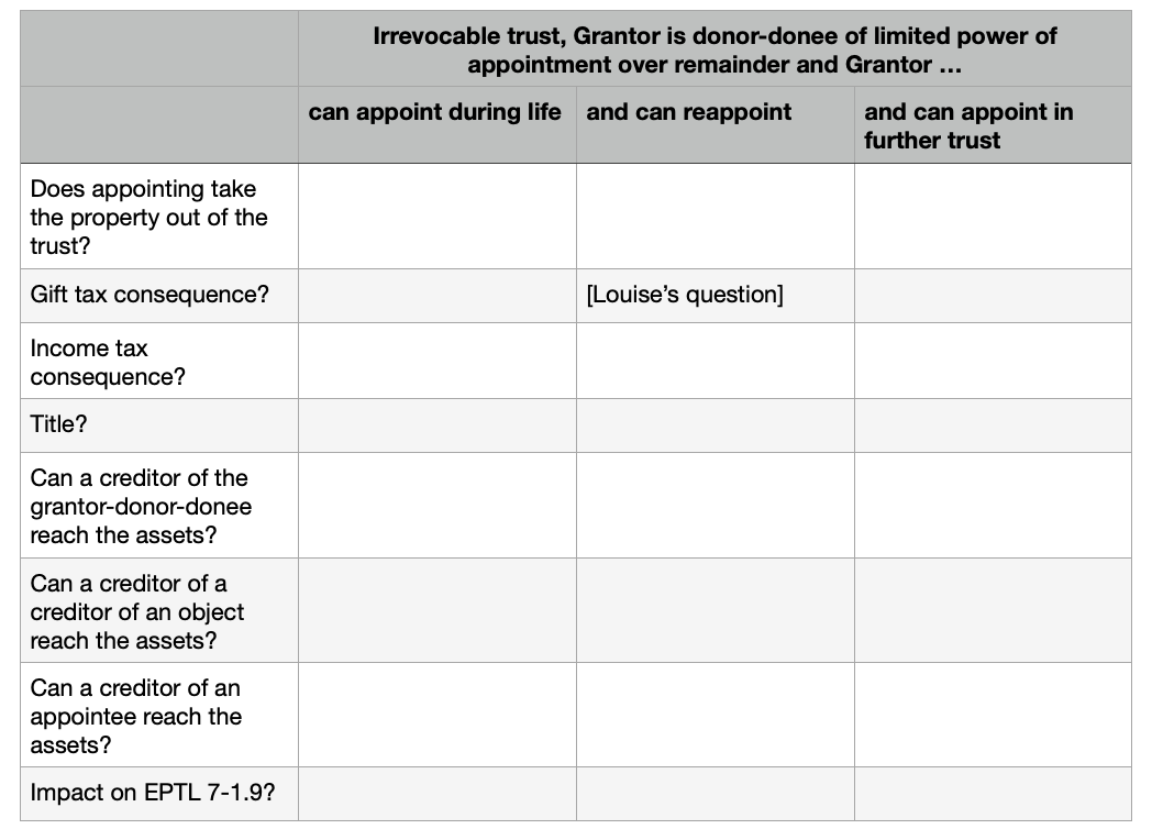 (1) What are the consequences of exercising the power -- gift tax (completed gift?), income tax, title, and creditor protection? Does appointing the remainder take it out of the trust?